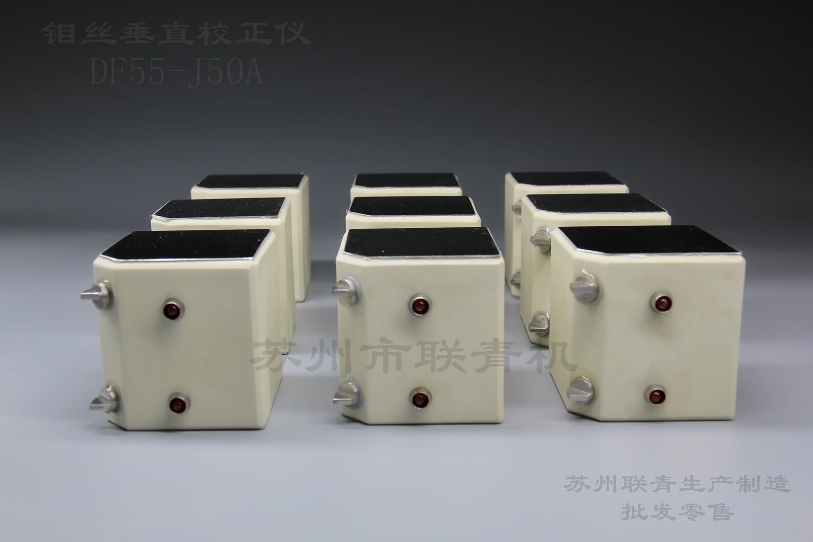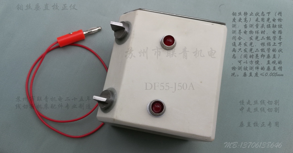 苏州联青机电DF55-J50A钼丝垂直校正仪是一种寿命长,耗电少,使用直观方便的检测工具,采用发光二极管显示,具有内接电源的光电检测工具,当测量头接触被测导电物体时,电路闭合,发光二极管导通并发光,根据上下两只发光二极管的状态,可以方便、直观地检测被测件的垂直情况。本校正器适用于各种型号的电火花线切割机床。